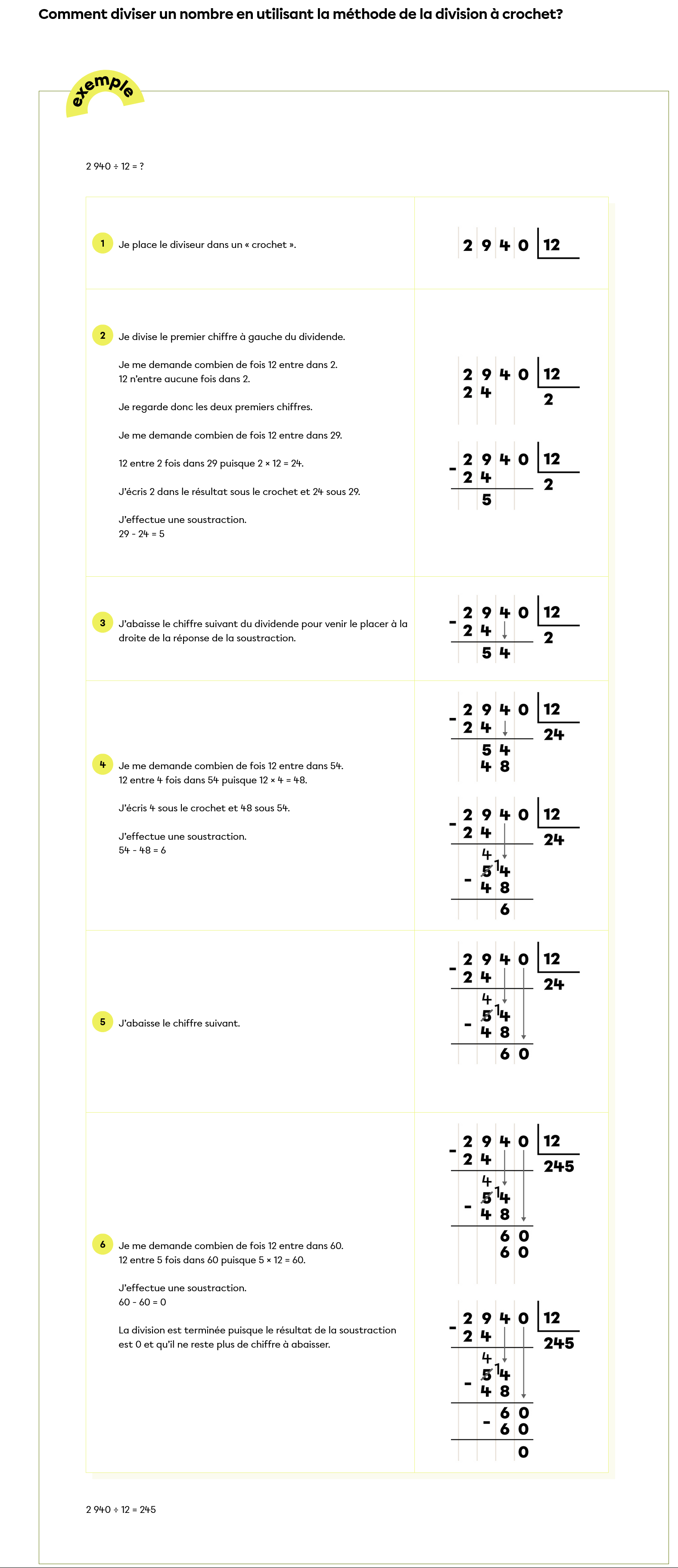 Pour diviser un nombre à 4 chiffres, je te recommande vivement la méthode de la division à crochet. Je te partage un extrait de notre fiche sur la division qui te montre la méthode à suivre. Si tu veux consulter davantage d'exemple, je t'invite à consulter la fiche au lien suivant : https://www.alloprof.qc.ca/fr/eleves/bv/mathematiques/diviser-des-nombres-primaire-m1618.