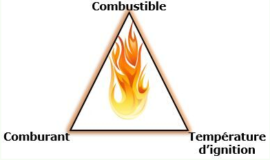 La combustion implique toujours un combustible, un comburant et une température d'ignition. Le tout peut être représenté par un triangle.