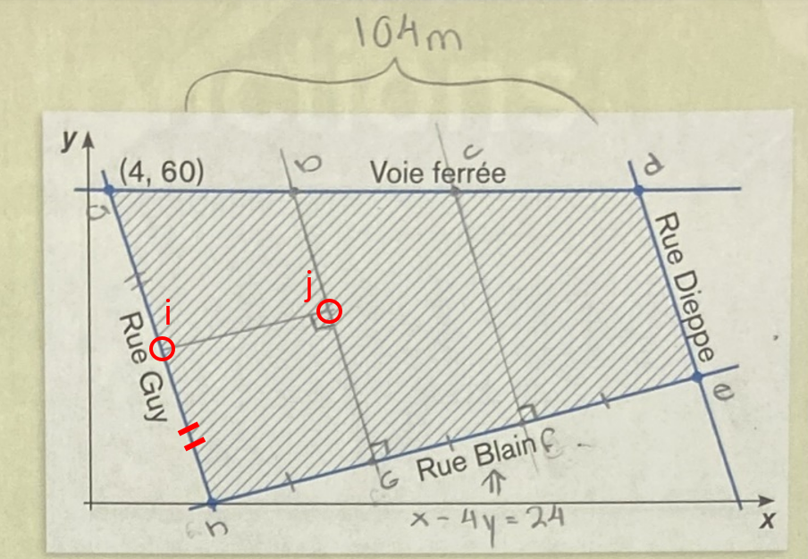 D'abord, certaines informations sont faciles à donner sans trop de calculs. Par exemple, le point d a comme abscisse 4+104 et ordonnée 60. De plus, le point h a comme ordonné 0 pusiqu'il est sur l'axe des x. Avec la règle x-4y=24, trouve l'abscisse. Avec ce dernier, tu as a et h, donc trouve la règle de la Rue Guy.