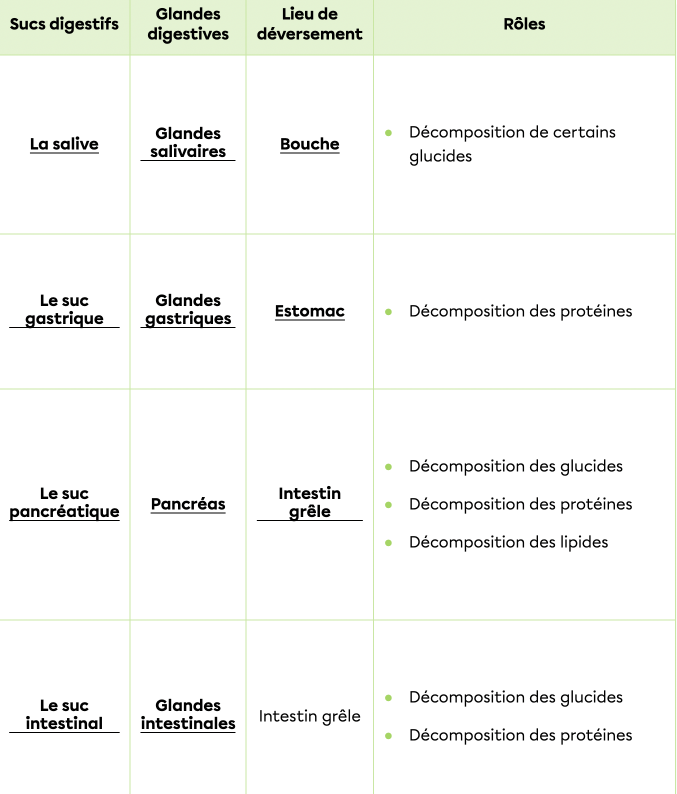 Les sucs digestifs sont des sécrétions de glandes digestives contenant des enzymes digestives.