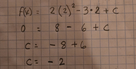 Tu as inséré les coordonnées du point (2, 0) dans l'équation, puis résolu celle-ci pour trouver la valeur de la variable \(c\). Tu n'as pas factorisé.