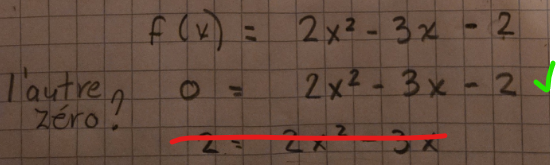 Ensuite, maintenant que tu as l'équation complète de la fonction, tu peux trouver les zéros en remplaçant y par 0, comme tu l'as fait ici :