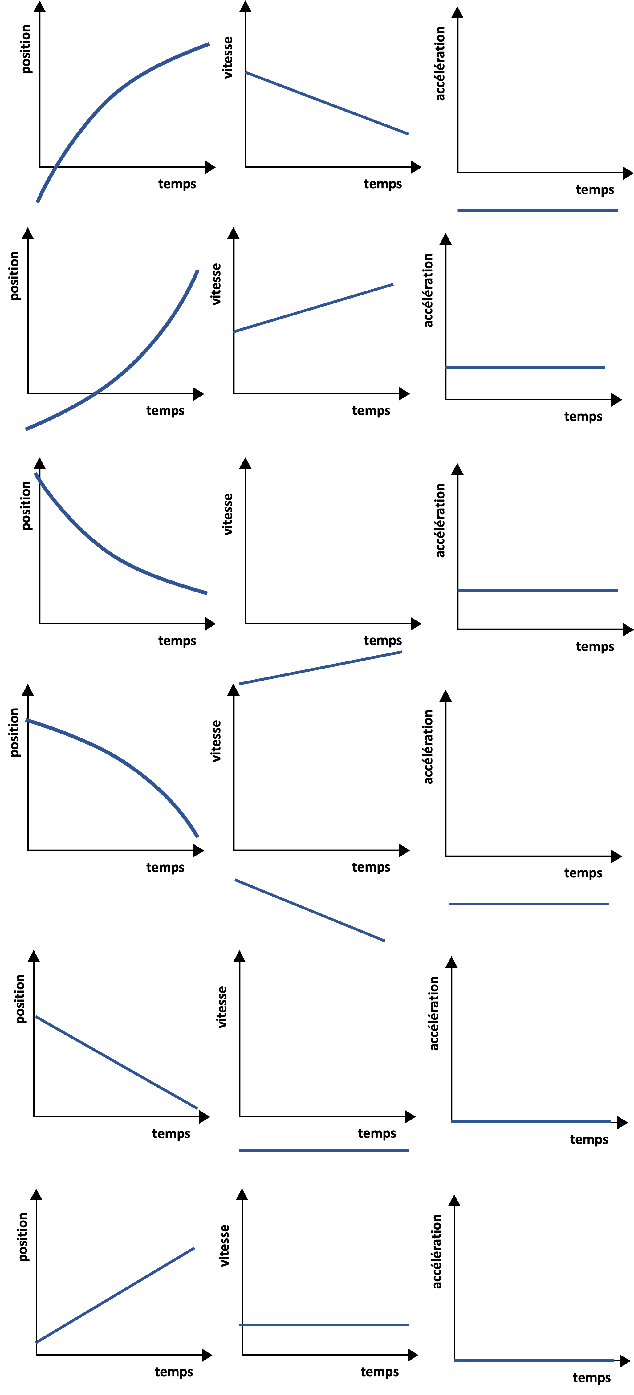 Tu peux les réviser et essayer d'y penser d'une manière différente! Tu peux aussi tenter de mémoriser les différentes formes de courbes du MRUA afin d'identifier la bonne forme de la courbe de la vitesse ou l'accélération selon le temps :