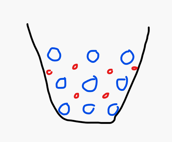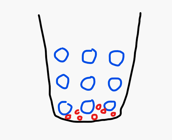 Les cercles bleus représentent les molécules de solvant et les cercles rouges représentent les molécules de soluté.