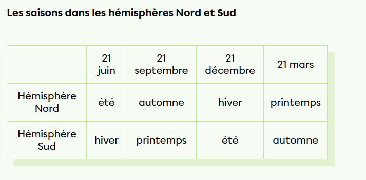 À noter : Les saisons sont inversées dans l'hémisphère Sud en comparaison avec l'hémisphère Nord. Par exemple, dans les environs du 21 juin, c’est l’été qui commence dans l’hémisphère Nord, alors que c’est l’hiver qui commence dans l’hémisphère Sud. Donc, pour répondre à ta question, oui!