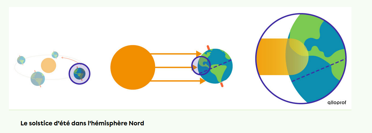 À ce moment, l'hémisphère Nord est incliné au maximum vers le Soleil. Il reçoit une plus grande quantité d'énergie solaire, car les rayons solaires le frappent presque perpendiculairement. Les rayons y sont donc plus concentrés.