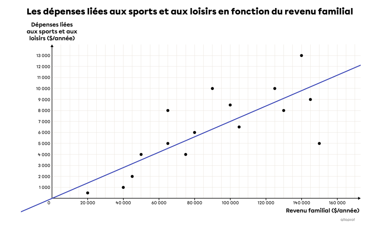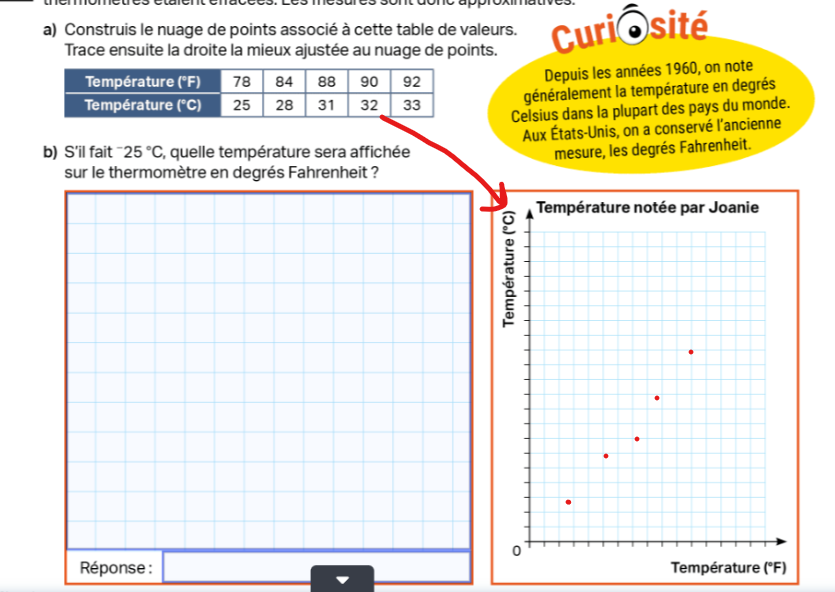 Tu dois alors tracer la droite qui sera la mieux ajustée à ce nuage. Voici un exemple :