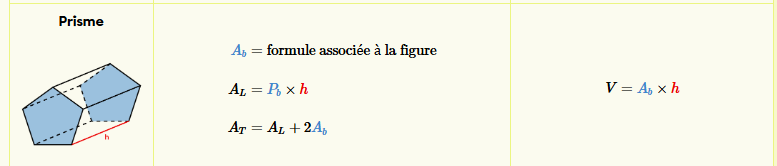 Voici la formule à utiliser pour calculer le volume (ou l'aire) d'un prisme :
