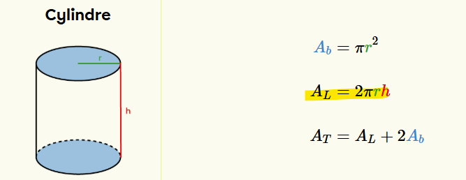 Tu dois commencer par calculer le rayon de ce cylindre. Pour cela, tu dois utiliser la formule de l'aire latérale :