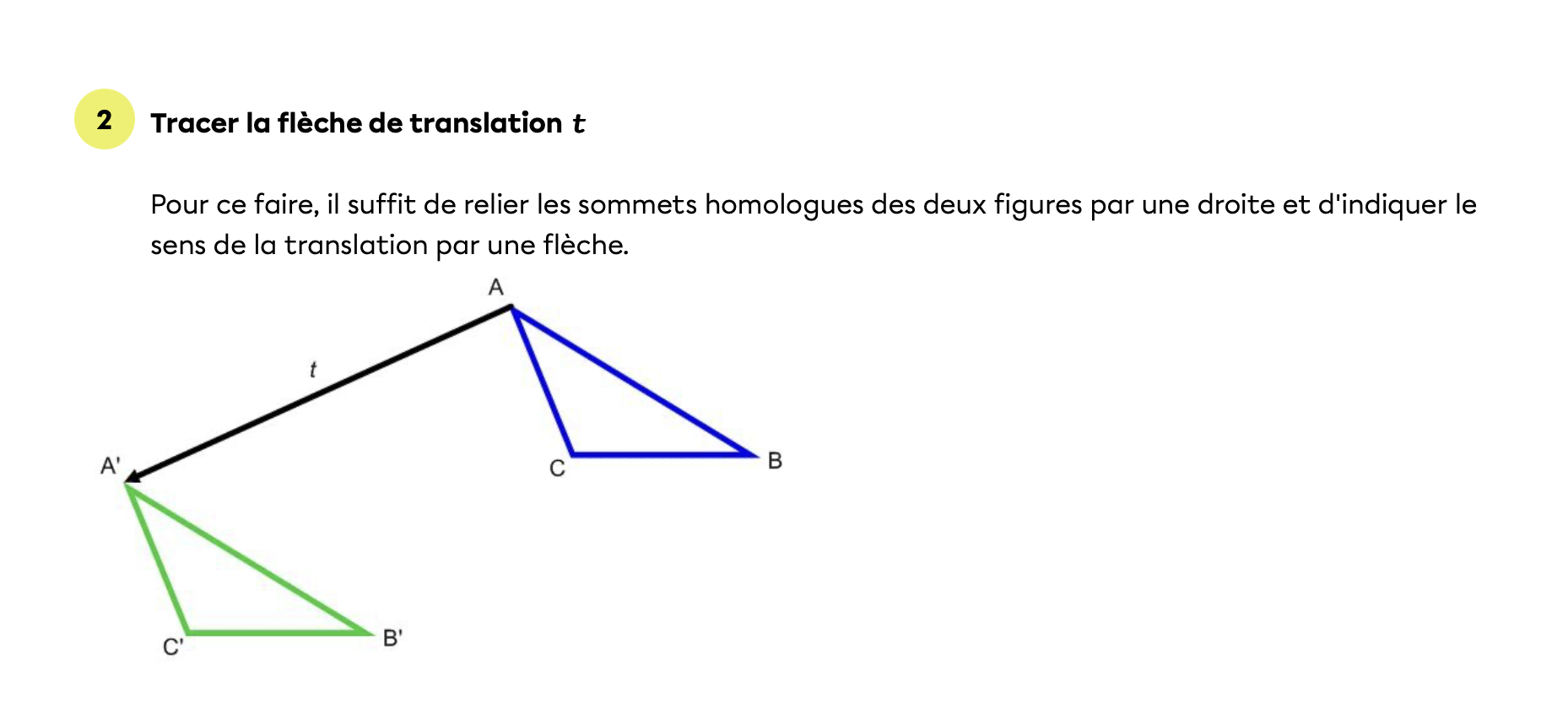 Tu dois commencer par tracer la flèche de translation des deux figures par les sommets homologues. Je vois que tu as déjà commencé cette démarche. N'oublie pas d'inscrire la pointe de ta flèche. Comme ceci: