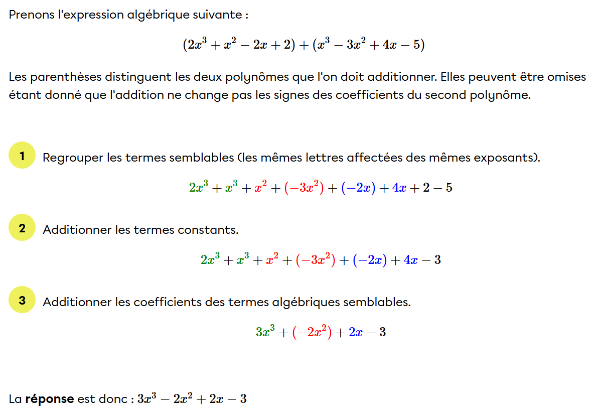 Ce sont ensuite les coefficients des termes semblables qui sont additionnés. Il faut aussi garder en tête qu'il faut toujours suivre la priorité des opérations lors de tes calculs. En voici un exemple: