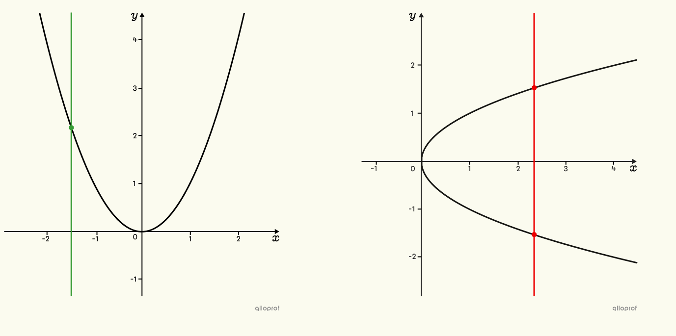 Une fonction est une relation entre deux variables où chaque valeur de la variable indépendante (ensemble de départ) est associée à une seule valeur de la variable dépendante (ensemble d’arrivée). C'est ce qui explique l'utilisation d'une droite verticale pour voir si cette droite touche au plus à un point: si ce n'est pas le cas et que la droite verticale touche à deux points ou plus, le graphique présente une relation et non une fonction. Par exemple, le graphique de gauche présente une fonction, mais celui de droite une relation: