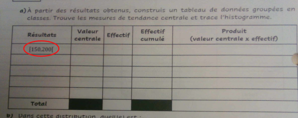 L'effectif est le nombre de données compris dans la classe. En d'autres mots, tu dois compter le nombre de données entre 150 inclusivement et 200 exclusivement pour avoir l'effectif de la classe [150, 200[.