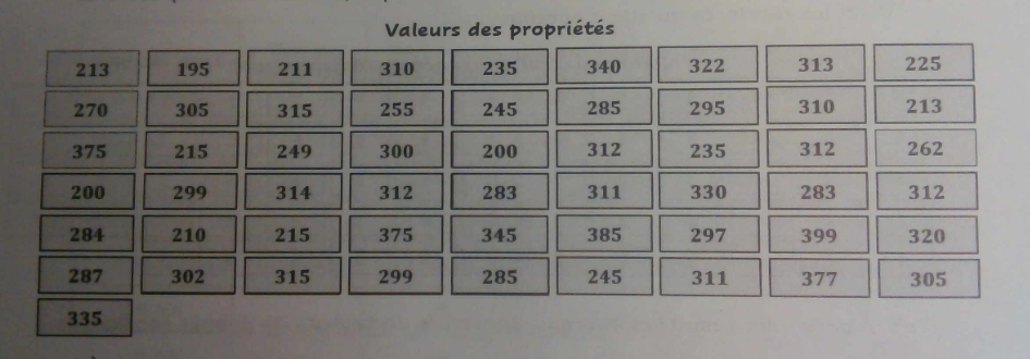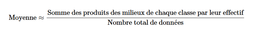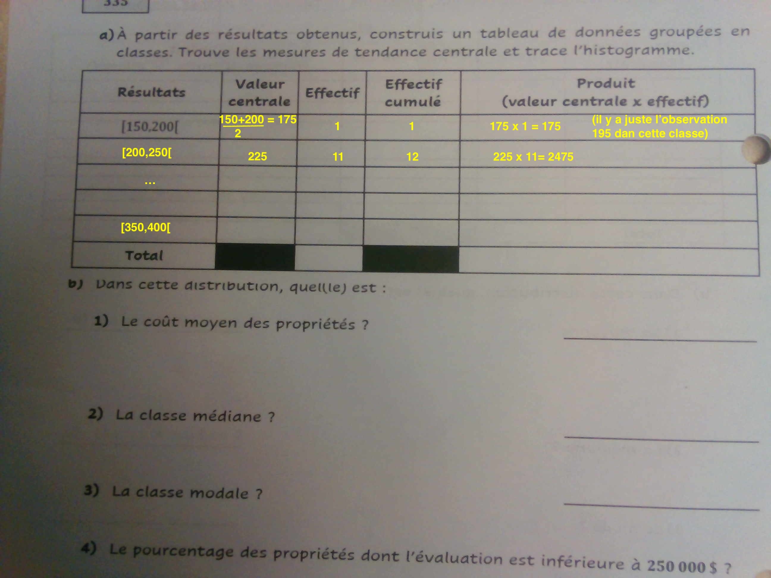 Ensuite, la valeur centrale est le nombre au milieu de la classe. Par exemple, la valeur centrale de la classe [150, 200[ est 175 :