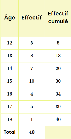 Par exemple, l'effectif cumulé dans la troisième ligne est 20, car 5+8+7 (les effectifs des données précédentes) = 20