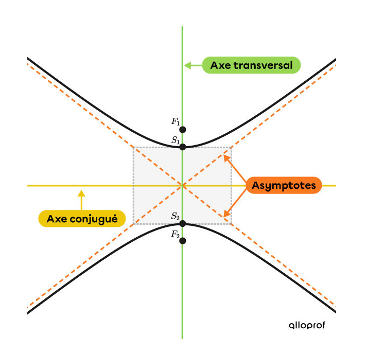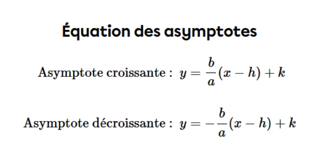 Sachant cela, tu peux placer le point (h, k) comme étant le centre, puis tracer les asymptotes dont les équations sont :