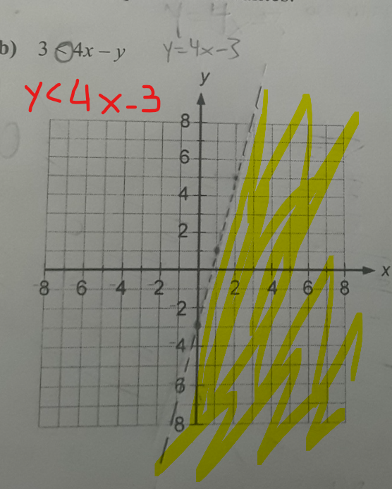 Maintenant, il ne te reste plus qu'à hachurer la région-solution à l'aide du signe d'inégalité. Puisqu'on a le symbole plus petit, alors la région-solution est en dessous de la droite :