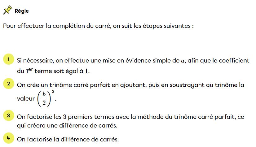 Ensuite, voici les étapes à suivre pour effectuer une complétion du carré :