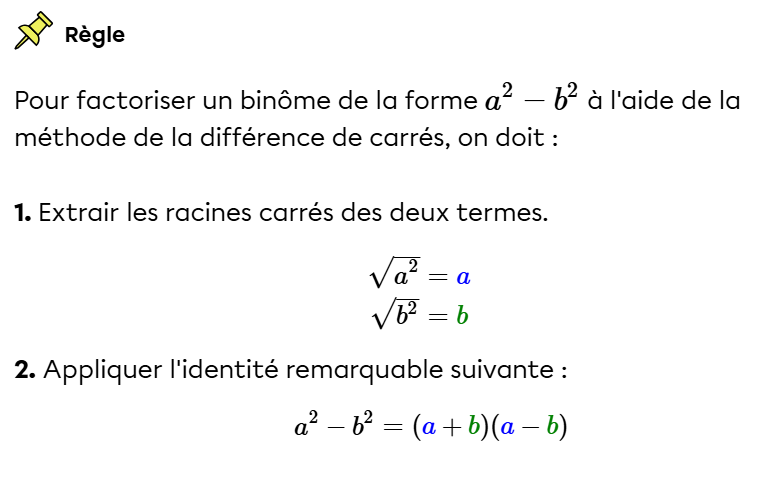 En d'autres mots, tu dois commencer par vérifier si tu as une expression composée de deux termes seulement. Ensuite, tu dois vérifier si on effectue bien une soustraction de ces deux termes, et non une addition. Puis, tu dois réécrire les termes afin de faire apparaitre un exposant 2 sur chaque terme (donc pour avoir des nombres carrés).