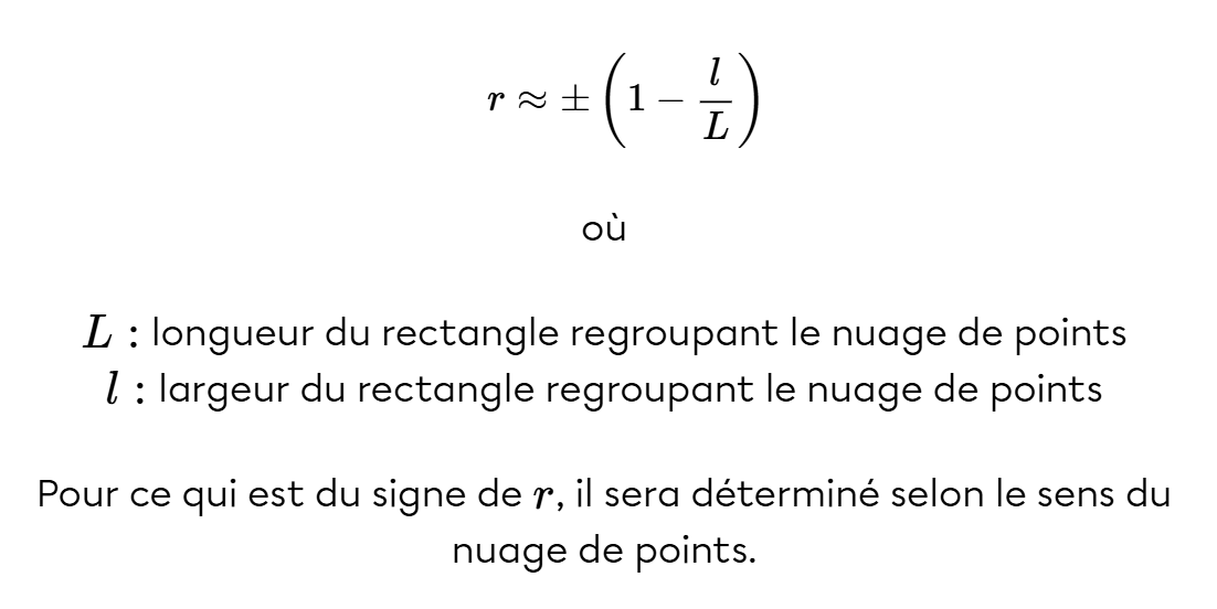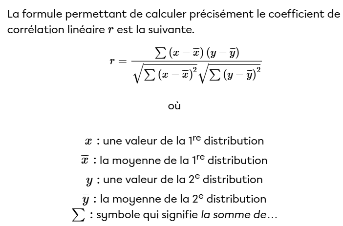 On peut calculer le coefficient de corrélation linéaire à l'aide de cette formule :