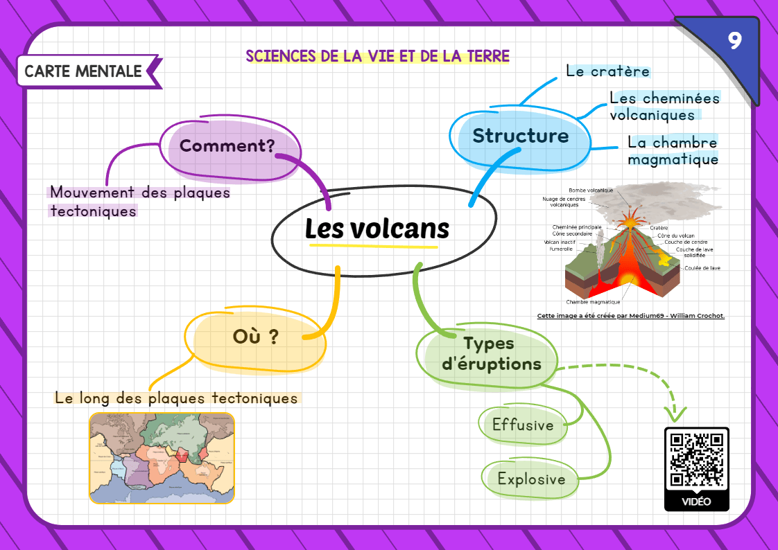 Merci beaucoup pour ta question! Personnellement, ma méthode d’étude préférée est la feuille mémoire sous forme de carte conceptuelle. C’est-à -dire qu’elle résume tout ce qui est à l’examen grâce à des mots clés et qu’elle présente les différents liens entre les concepts. Voici un exemple de carte conceptuelle pour les volcans :