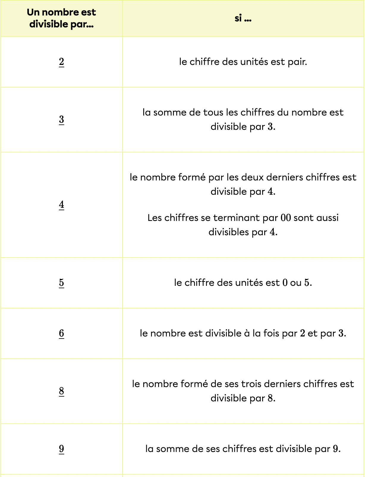 Il existe des critères qui permettent de déterminer rapidement si un nombre est divisible par un nombre donné. On appelle ces critères les critères de divisibilité.