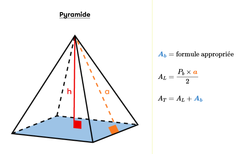 À la question 1), on peut calculer l'aire latérale directement, grâce à la mesure de l'apothème et la mesure d'un côté de la base (tu pourras trouver le périmètre en multipliant par 3 la valeur de ce côté, vu que la base est un triangle).