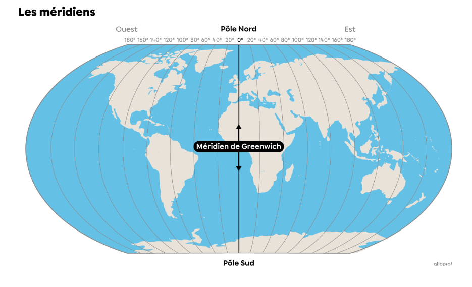 Tu peux également visualiser la longitude à l'aide des méridiens: