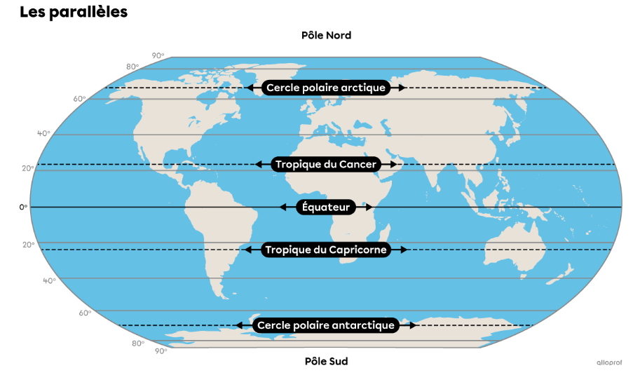Tu peux visualiser la latitude à l'aide des parallèles: