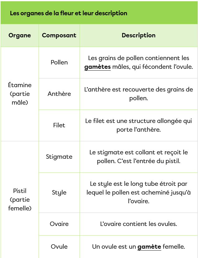 Une fleur peut contenir à la fois des organes mâles, les étamines, et un organe femelle, le pistil. L'étamine contient le pollen, tandis que le pistil reçoit le pollen.
