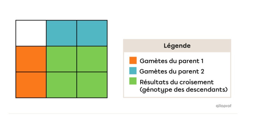 On va donc placer les gamètes d’un parent dans les cases de la première ligne et ceux de l’autre parent dans les cases de la première colonne. On assemble ensuite les gamètes dans les cases du centre pour obtenir les génotypes possibles des descendants.