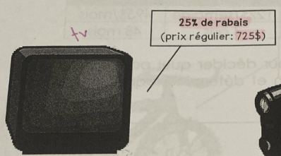 Tu devras calculer le 25% de 725$ (ce qui te donnera le montant d'argent économisé). Ensuite, tu devras soustraire le résultat de 725$ (ce qui te donnera le prix après rabais).