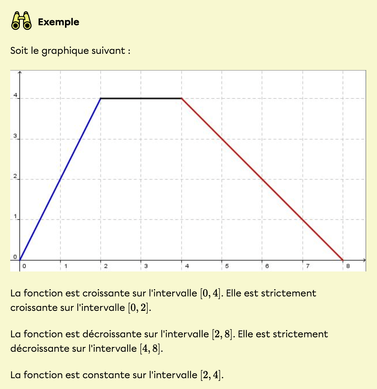 On parle de croissance lorsque, sur un intervalle donné du domaine d'une fonction, l'image de celle-ci ne diminue pas. La croissance correspond donc à un intervalle en x sur lequel les valeurs de y ne diminuent pas : les valeurs de y augmentent ou restent constantes. En somme, si la courbe monte lorsque x augmente, on dit que la fonction est croissante.