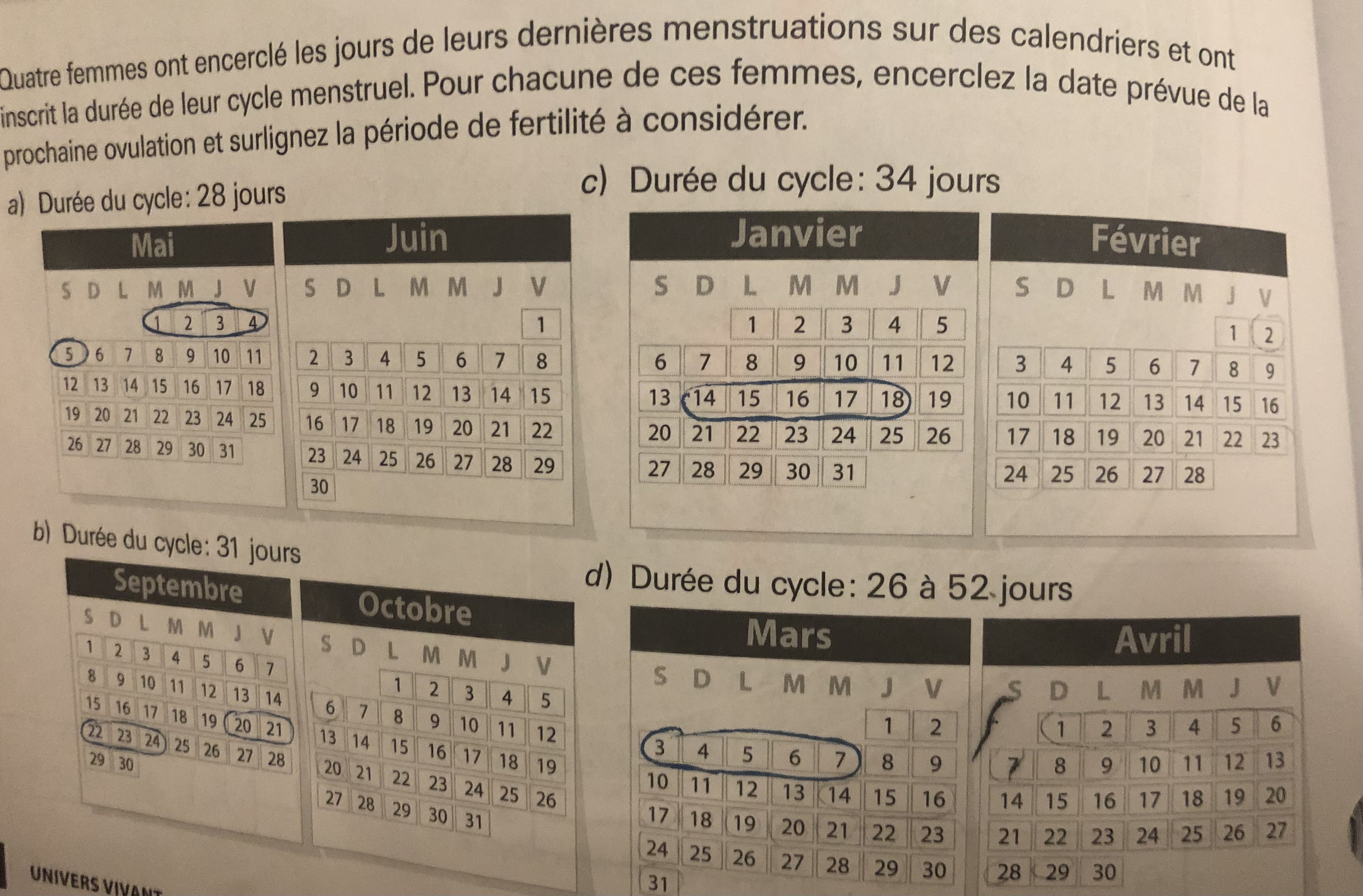 L'ovulation a lieu 14 jours après le premier jour de menstruation. Ainsi, tu peux trouver le jour d'ovulation en comptant 14 jours après la première journée de menstruation. En a), le premier jour d'ovulation serait ainsi le 15 mai.
