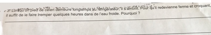 Le céleri est composé à majorité d'eau. Lorsqu'il est laissé longtemps au réfrigérateur, il perd peu à peu son eau et se ramollit donc. Lorsqu'on le plonge dans de l'eau froide, celle-ci va pénétrer dans le céleri par osmose, et lui redonner sa texture initiale.