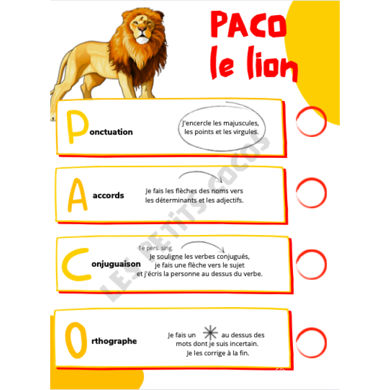 PACO est un acronyme aide-mémoire pour la correction de ton texte. Il te donne un code de correction pour t'assurer de faire le moins d'erreurs possibles dans ta production écrite.