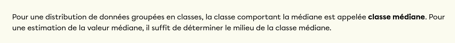 La médiane représente la donnée centre de ta distribution de données. Si le nombre de données dans ta distribution est impair, la médiane sera un nombre dans ta distribution. Si le nombre de données dans ta distribution est pair, tu devras faire la moyenne entre les deux données qui entoureraient la médiane (étant donné que le nombre de données de chaque côté est égal).