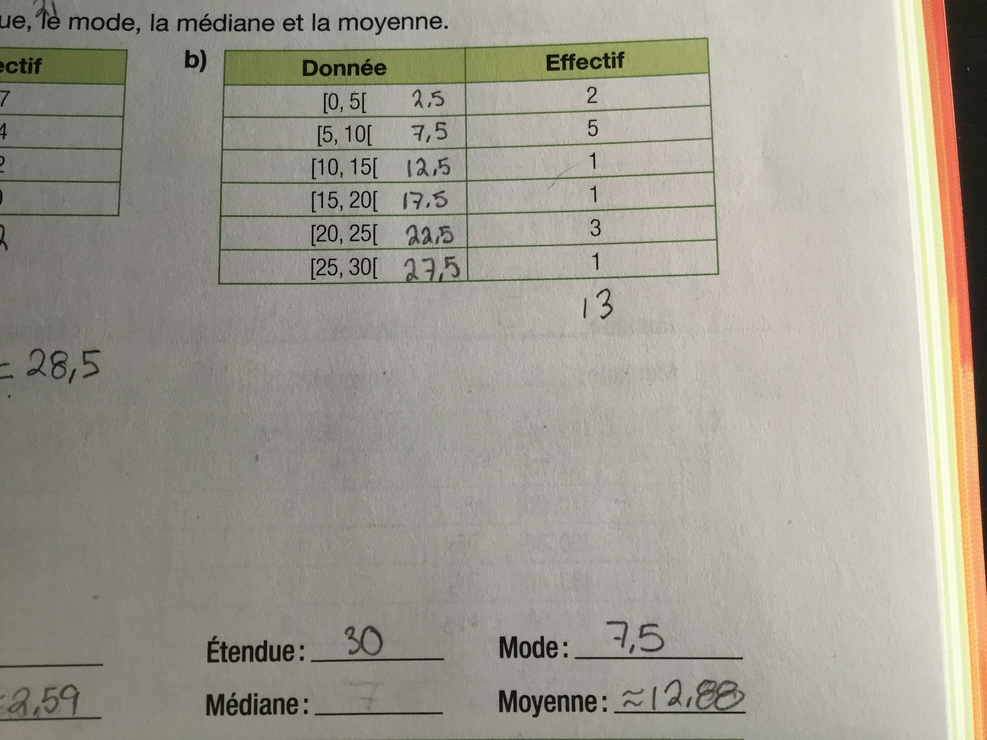 Comme tu n'as pas les données à l'origine des intervalles, faute de mieux, tu utilises le point milieu de l'intervalle correspondant à la médiane.