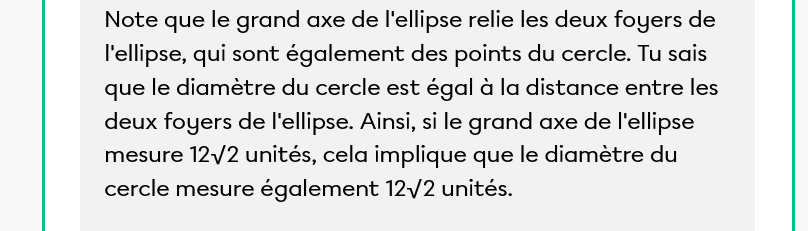 Note que le grand axe de l'ellipse relie les deux foyers de l'ellipse, qui sont également des points du cercle. Tu sais que le diamètre du cercle est égal à la distance entre les deux foyers de l'ellipse. Ainsi, si le grand axe de l'ellipse mesure 12√2 unités, cela implique que le diamètre du cercle mesure également 12√2 unités.