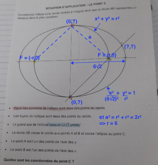 Le point C, quant à lui, doit satisfaire à la fois l'équation de la droite AB et l'équation de l'ellipse.