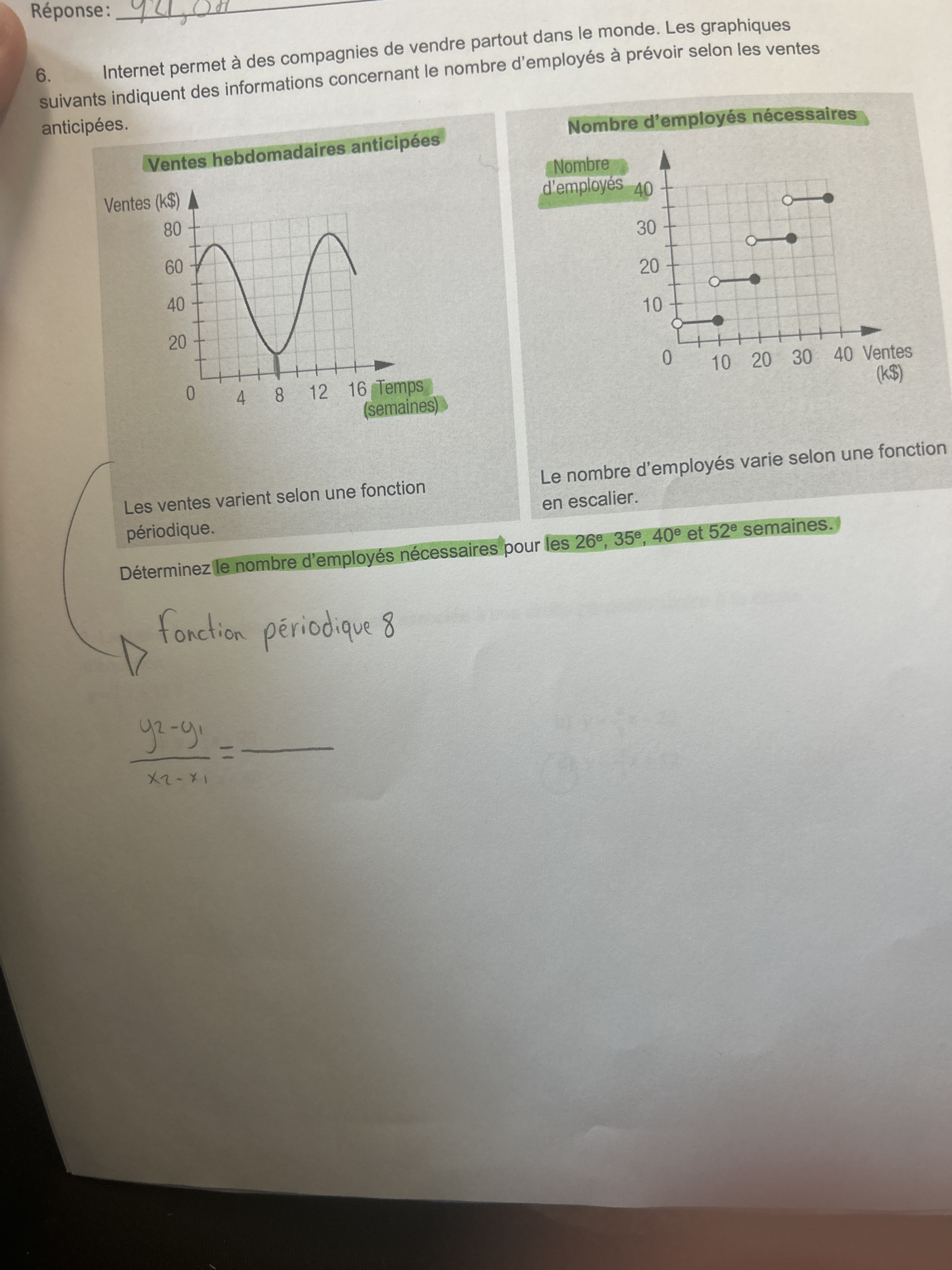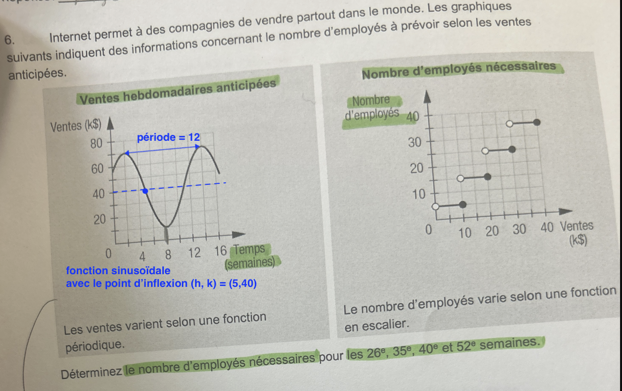 Commence par trouver la fonction sinusoïdale du montant de la vente en fonction du temps (en semaines). Va voir