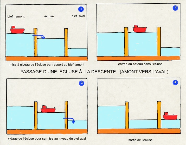On retrouve généralement les écluses dans les canaux afin de permettre aux bateaux de passer d'un niveau d'eau à l'autre. Voici une image qui résume le principe :