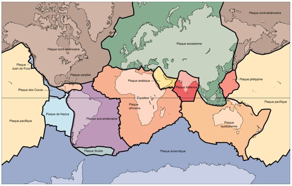 La lithosphère est composée de plaques tectoniques qui se déplacent constamment. Voici une représentation de ces plaques :
