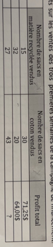 Pour trouver le profit de la semaine trois, tu dois d'abord déterminer le profit généré par un sac en matière recyclée et un sac en cotons vendus.