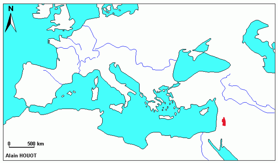 Sur la carte que tu as utilisée, la Palestine se trouverait à peu près à cet endroit (en rouge) :