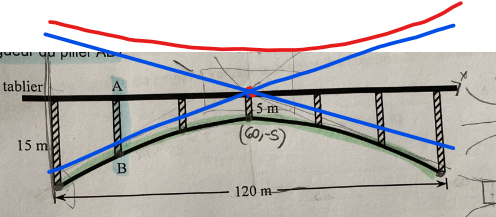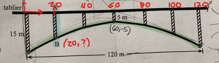 Tout d'abord, tu dois comprendre que tu cherches la règle de l'hyperbole pour pouvoir ensuite calculer y lorsque x=20. Puisque les piliers sont distancés également et qu'ils couvrent 120 m au total, ils sont donc distancés de 20 m chacun.