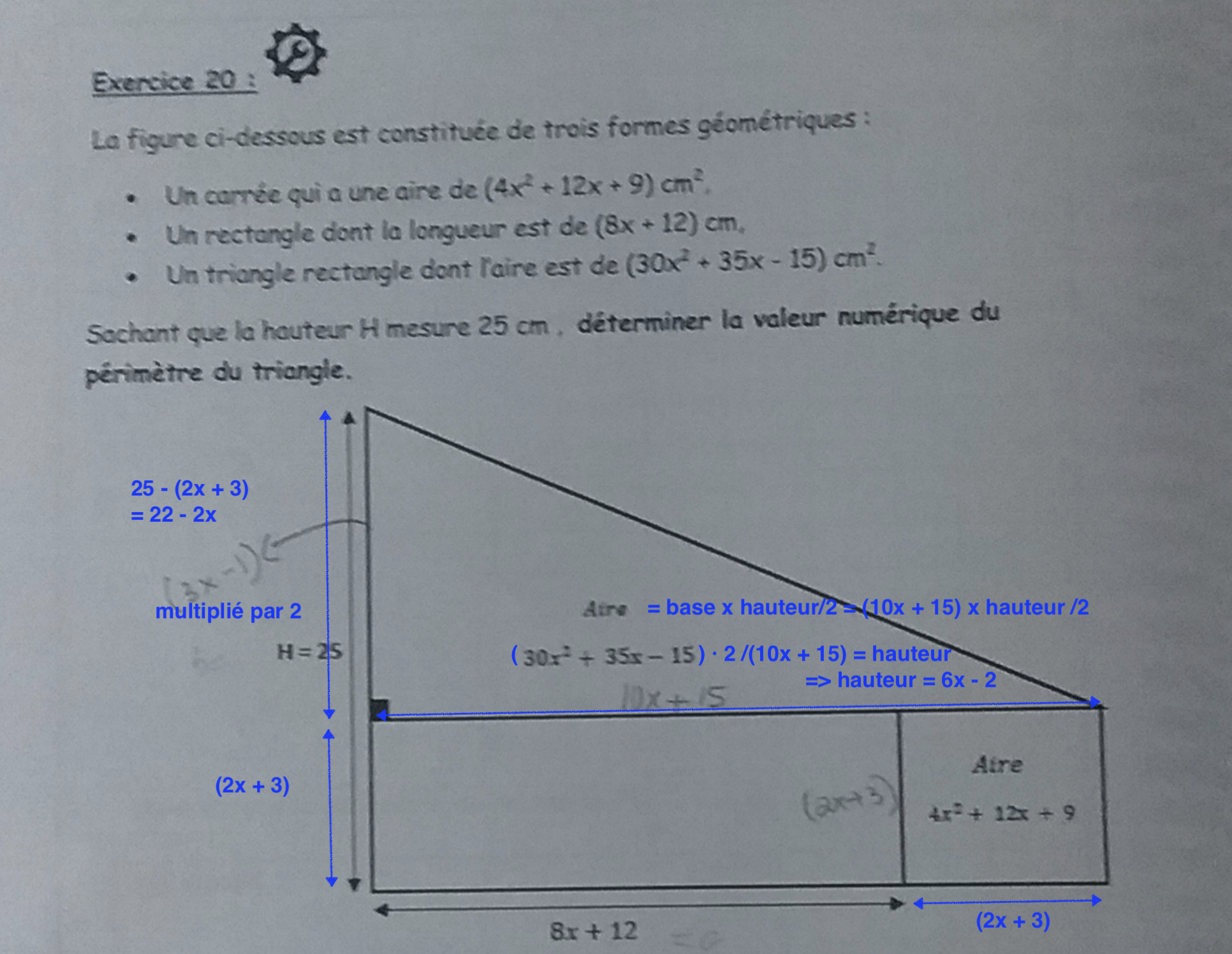 Tu sais que la hauteur du triangle est de 25 et que la base est de 10x+15. Tu sais aussi que l'aire est de 30x²+35x-15.