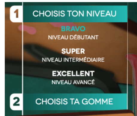 Pour jouer à Gommophone, tu dois d'abord choisir un niveau. À titre d'exemple, si c'est la première fois que tu joues, tu peux choisir le niveau débutant :