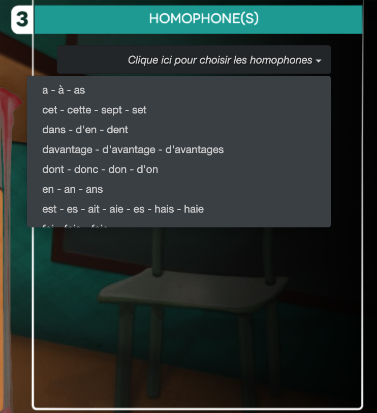 Ensuite, tu dois choisir les homophones que tu aimerais pratiquer parmi la liste :