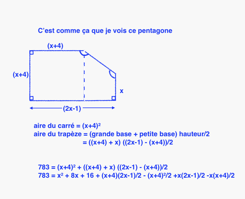 En sachant que l'aire du pentagone est de 783 cm^2, déterminez la longueur du côté dont la mesure est représentée par la lettre x.